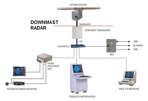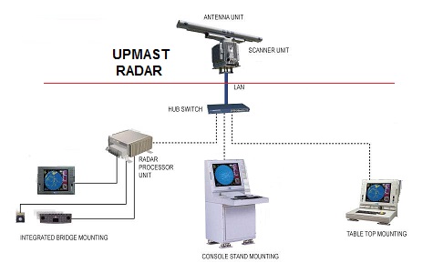 در رادار های آپ مست قسمت ترنسیور و اسکنر در بالای مست نصب میشوند و قسمت نمایشگر در اطاق پل فرماندهی.